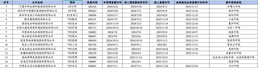 随着*ST金灵和*ST景峰公开披露重整计划草案,2025年进入重整程序的上市公司重整工作也即将落下帷幕,那么我们今天就来看一下2025年进入重整程序的15家上市公司的相关情况。