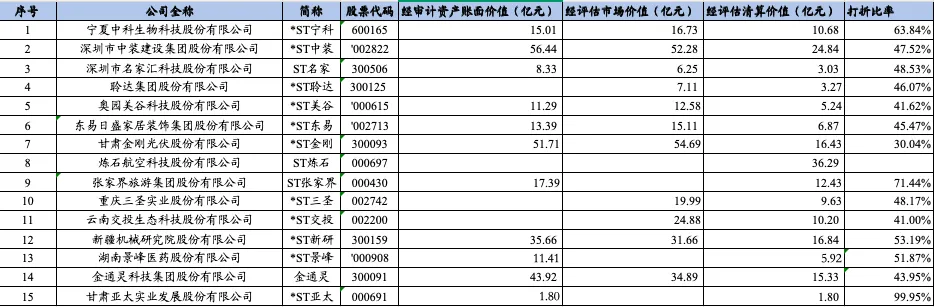 有效剩余资产,特别是经中介机构评估的资产清算价值,是上市公司重整程序中制定债务清偿方案的基础。根据15家上市公司重整计划的公开披露情况,各家上市公司资产账面价值、评估市场价值、评估清算价值如下: