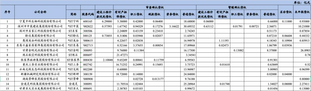 根据15家上市公司重整计划的公开披露情况,各家上市公司债权申报与审查情况如下: