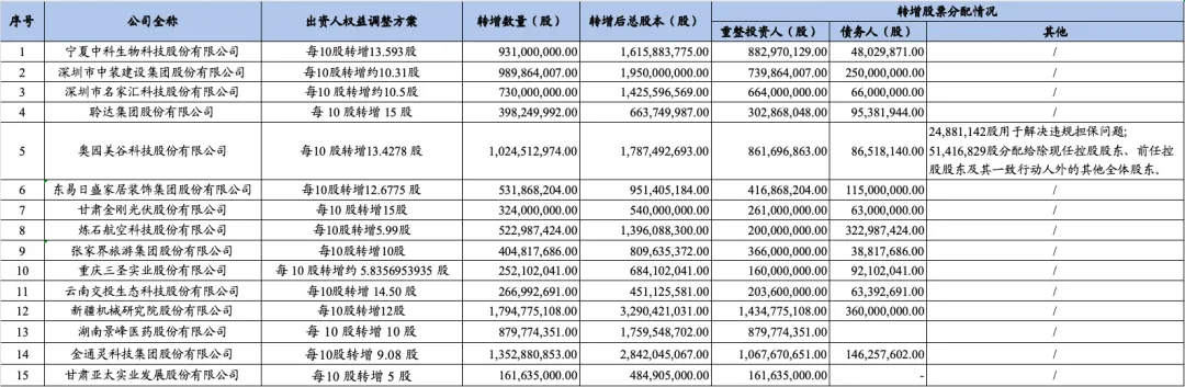 根据15家上市公司重整计划的公开披露情况,各家上市公司出资人权益调整方案如下: