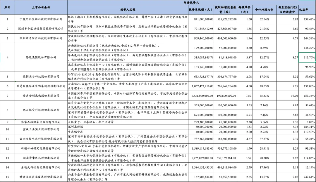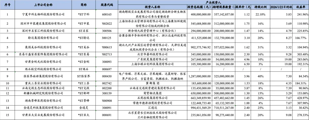 根据15家上市公司重整计划的公开披露情况,各家上市公司产业投资人和财务投资人招募情况如下: