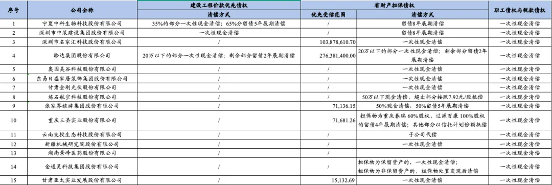 优先债权主要是建设工程价款优先债权、有财产担保债权、职工债权和税款债权,各家上市公司的债务清偿方案如下: