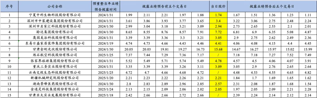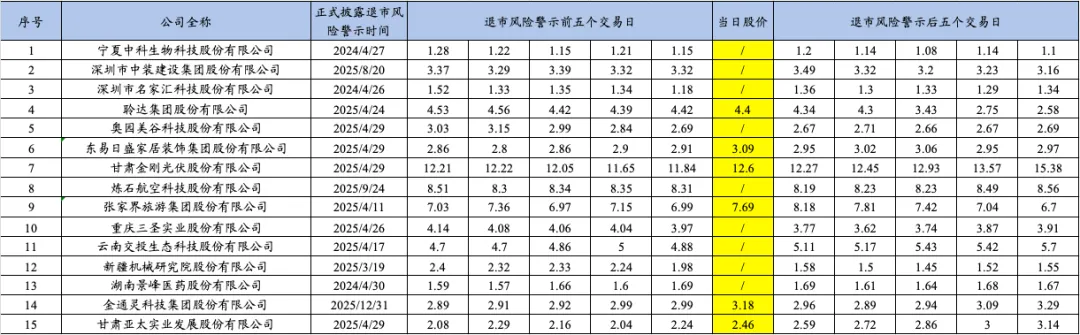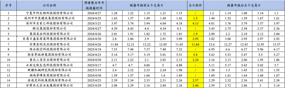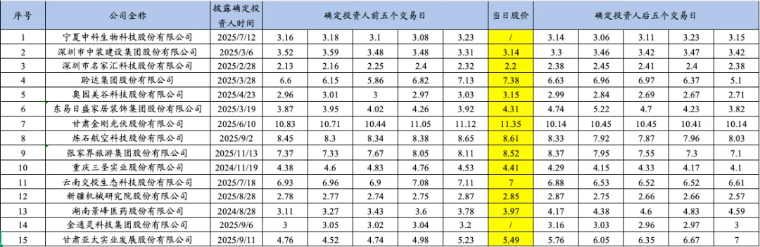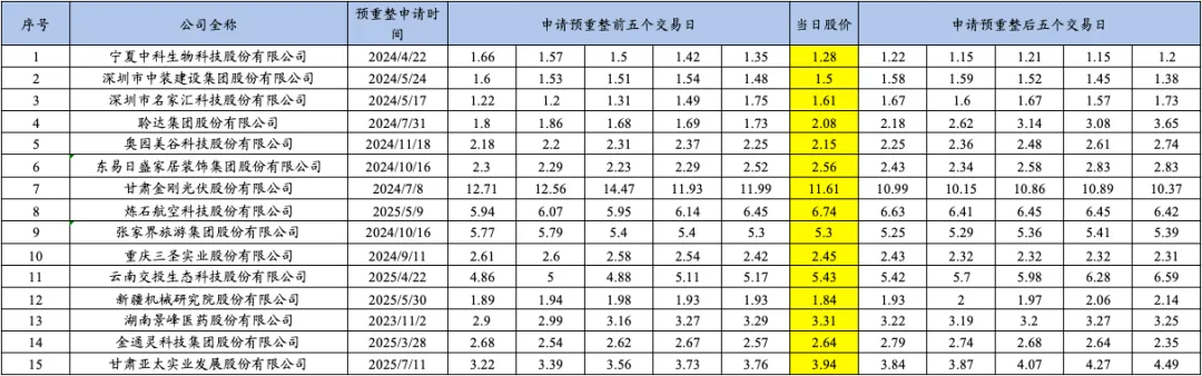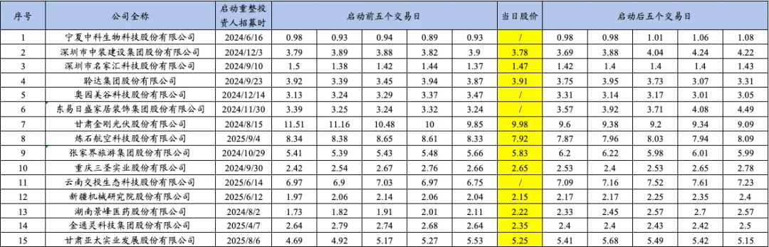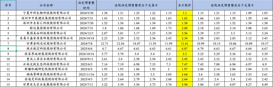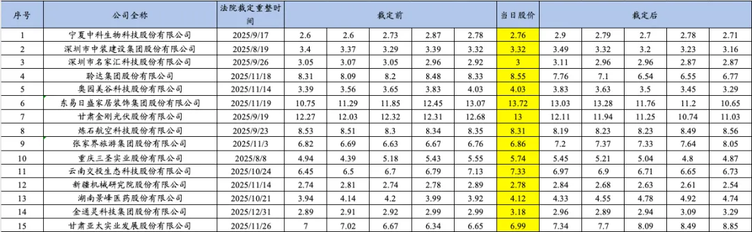 博主统计了2025年重整的15家上市公司自进入预重整当年的业绩预告披露时点、年报披露时点、被交易所实施退市风险警示时点、被申请预重整时点、法院决定预重整时点、启动重整投资人招募时点、确定重整投资人时点、正式进入重整程序时点前后的股票收盘价变动情况,具体如下: