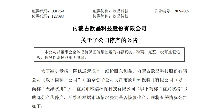 1月23日,欧晶科技(SZ:001269)发布公告,公司全资子公司天津市欧川环保科技有限公司、宜兴市欧清环保科技有限公司的部分产线停产,后续将根据市场情况决定是否恢复生产。