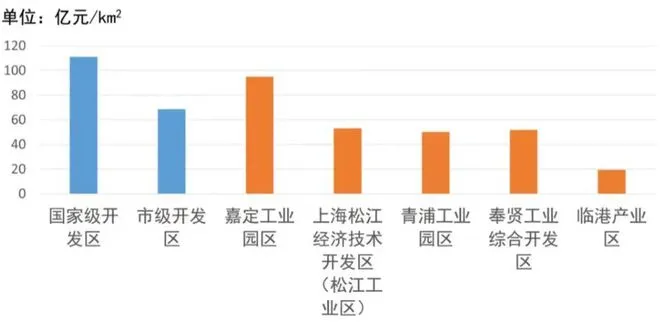 根据上海市政府在《关于本市“十四五”加快推进新城规划建设工作的实施意见》中对五大新城的不同定位,嘉定新城聚焦制造业和服务业,青浦新城快速发展电商和物流,松江新城支持旅游影视、电子信息,奉贤新城发展“世界化妆品之都”,南汇新城则推进前沿产业,例如生物医药、新能源汽车和高端智能,五大新城均规划了各具特色的发展方向。但在新城的实际发展中,由于新城间原本存在的工业基础差异、人口基数差异等,还是不可避免的出现不同新城间在国民生产总值这一指标上有较大区分度,在各新城主要园区的地均工业产值中可以发现端倪(详见图3)。