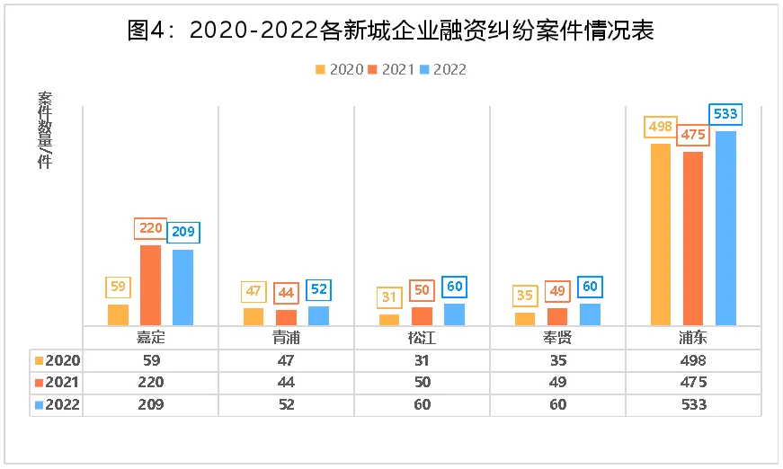 在2020年至2022年间五大新城审结的2242件企业融资纠纷案件中,嘉定新城有488件、青浦新城有143件、松江新城141件、奉贤新城144件、浦东新区1506件,由于南汇新城在行政区划上归属于浦东新区,为便于统计,将浦东新区全区数据纳入分析。