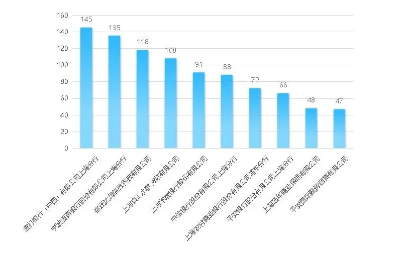 从案件具体来源来看,数量前十的企业分别为渣打银行(中国)有限公司上海分行145件、宁波通商银行股份有限公司上海分行135 件、宿迁达润信息科技有限公司118件、上海京汇小额贷款有限公司108件、上海华瑞银行股份有限公司91件、中信银行股份有限公司上海分行88件、上海农村商业银行股份有限公司浦东分行72件、平安银行股份有限公司上海分行66件、上海通华商业保理有限公司48件、平安国际融资租赁有限公司47件(详见图8)。上述数据反映出当前中小微企业融资途径除银行等传统金融机构外,还包括网络借贷平台、保理公司、融资租赁公司等非传统融资渠道。同时,涉诉较多的银行多为股份制银行、城商行、农商行或其他银行,国有银行案件数量较为均衡。