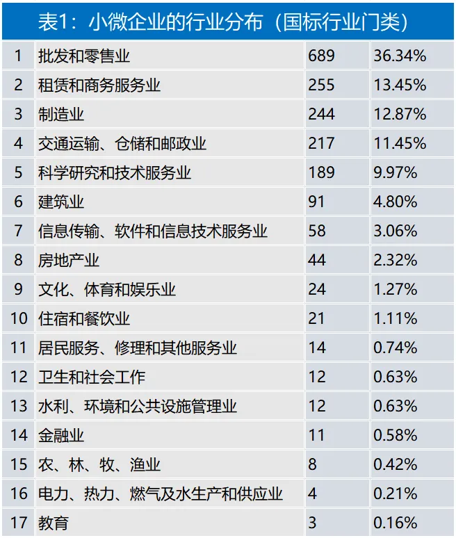 在全部案件中,共涉及2228家企业,其中小微企业共1896家,占比85.10%。按照国标行业门类划分标准,涉诉小微企业的行业分布主要在:批发和零售业689家,占比36.34%、租赁和商务服务业,255家,占比13.45%、制造业244家,占比12.87%、交通运输、仓储和邮政业217家,占比11.45%、科学研究和技术服务业189家,占比9.97%、建筑业91家,占比4.80%、信息传输、软件和信息技术服务业58家,占比3.06%、房地产业家44家,占比2.32%、文化、体育和娱乐业 24家,占比1.27%。(详见表1)
