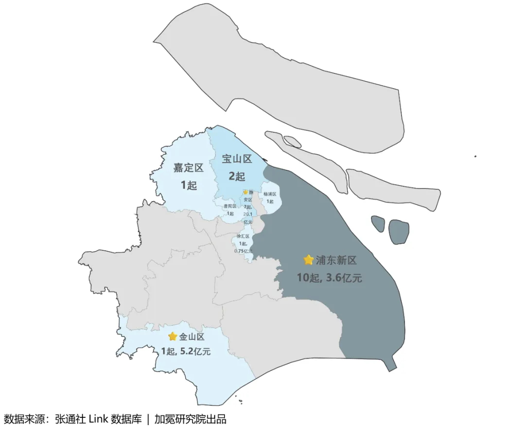 从行政区域分布来看,本周上海共有8个区发生融资事件。浦东新区融资事件数量最多,有12起。其余各区发生1-2起融资事件。其中,静安区发生1起2.87亿美元D轮大额融资,金山区发生1起约亿美元的B轮大额融资。