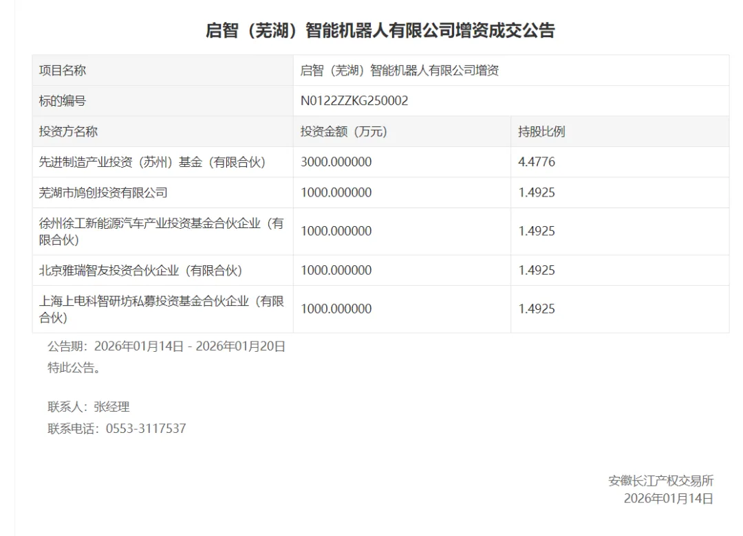 近日,据长江产权交易所消息,启智(芜湖)智能机器人有限公司完成新一轮融资,投资方包括国投招商、芜湖鸠创投基金、徐州云汉投资、雅瑞资本、上海电科。投资金额分别为3000万元、1000万元、1000万元、1000万元、1000万元、1000万元。启智智能机器人曾在2024年5月31日完成天使轮融资,国投招商为独家投资方。