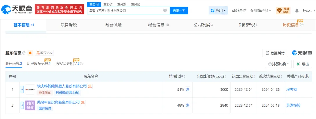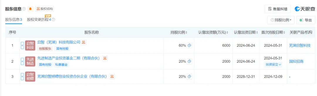 天眼查App股权信息显示,该公司由启智(芜湖)科技有限公司控股,持股比例53.7313%,后者由埃夫特智能机器人股份有限公司持股51.00%,芜湖科创投资基金有限公司持股49.00%。