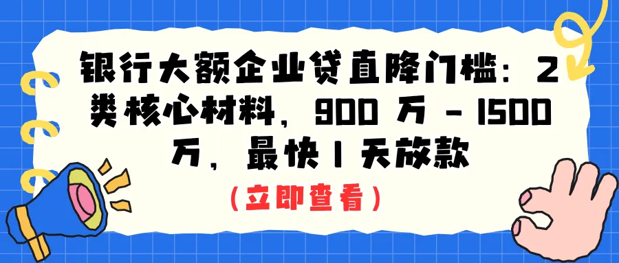 “手握千万商机,却被资金缺口卡住?”“传统大额贷材料堆成山,审批等半月,商机早溜走?”“缺抵押、负债适中,想贷千万比登天难?”2026年开年,银行大额企业贷迎来颠覆性变革!响应财政部民间投资专项担保计划与央行普惠金融新政,全国性银行及地方优质机构集体升级产品,门槛直降到底:仅需2类核心材料,无需房产抵押、无需第三方担保,即可申请900万-1500万高额授信,依托AI智能风控,最快1天完成全流程放款,部分企业8小时内资金到账,彻底打破“大额贷=高门槛、长周期”的固有认知。这波新政并非短期营销噱头,而是政策托底+技术赋能的双重结果,背后有5000亿元专项担保资金与1.5%财政贴息加持,精准适配成长型企业扩产、研发、接单等大额资金需求。今天这篇指南,结合官方政策、银行实测产品、真实案例,从核心优势、申请实操、案例解析、避坑指南四大维度,帮企业主吃透这波千万融资红利!