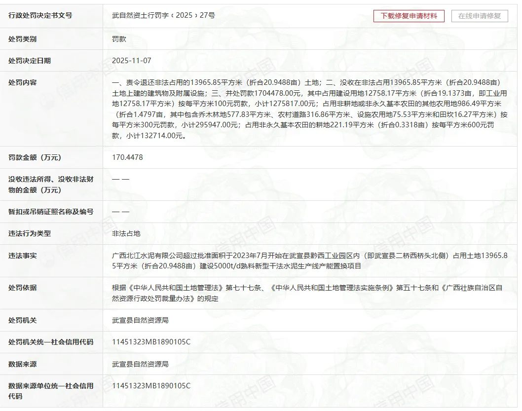 近日,广西壮族自治区来宾市武宣县自然资源局对广西北江水泥有限公司非法占地行为作出行政处罚,责令其退还非法占用的土地,没收在非法占用土地上新建的建筑物及附属设施,并处罚款约170.44万元。