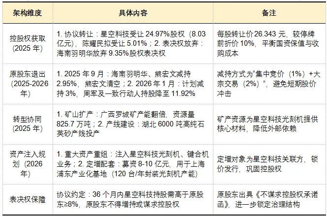 1. 广东星空科技装备有限公司(直接控股股东)2021年成立,注册资本2.94亿元,实控人贺荣明持股74.43%,核心业务为半导体高端装备制造(光刻机、键合机、量测设备),2024年封装光刻机出货超200台,2025年KrF 248nm扫描光刻机完成SiC客户验证。2025年6月以8.03亿元受让中旗新材23.74%股权(可转债转股后),核心目标:一是借助中旗新材石英材料资源(矿山+高纯砂)完善半导体产业链;二是通过上市平台实现设备资产证券化,2026年计划注入光刻机业务。