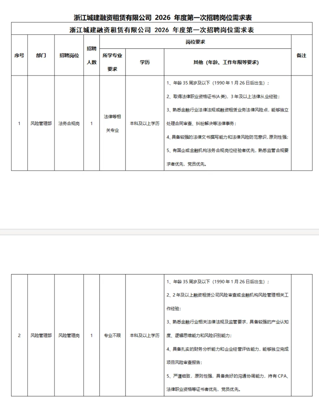 为进一步优化人才队伍结构,推动业务发展,浙江城建融资租赁有限公司面向社会公开招聘工作人员,现将招聘公告及有关事项发布如下: