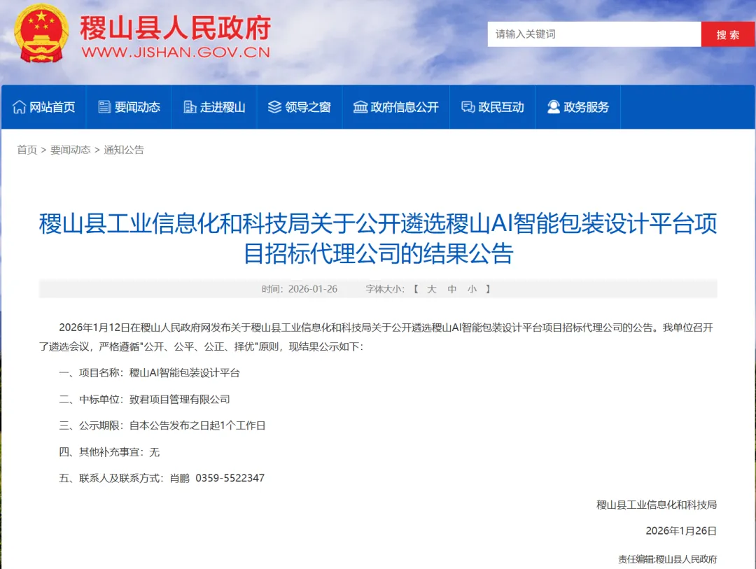 关于公开遴选稷山AI智能包装设计平台项目招标代理公司的结果公告
