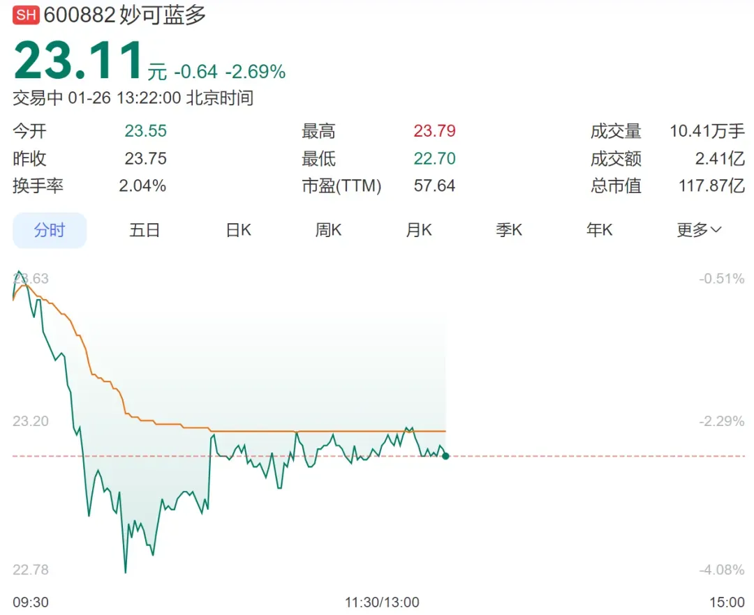 二级市场方面,截至发稿,妙可蓝多跌2.69%,报23.11元,总市值118亿元。