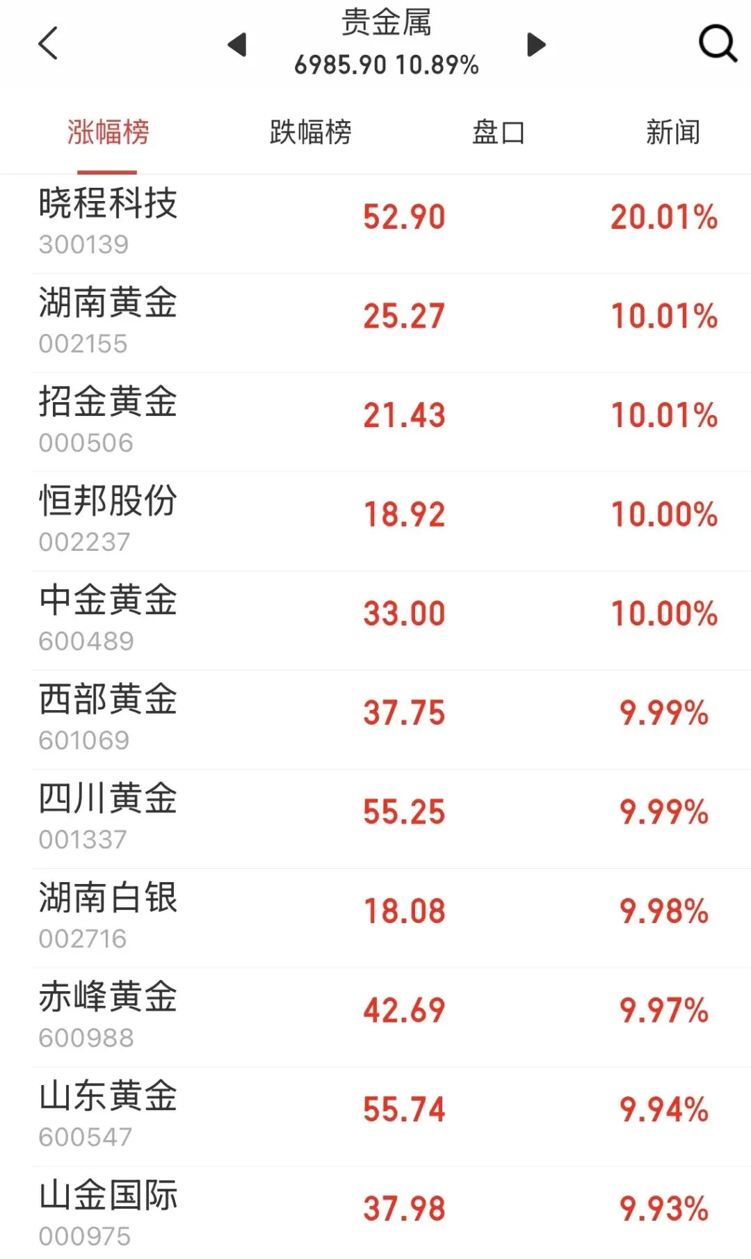 1月26日,贵金属板块领涨A股,中国黄金涨停,走出罕见2连板。截至下午收盘,晓程科技20cm涨停,另有十几只个股涨停。