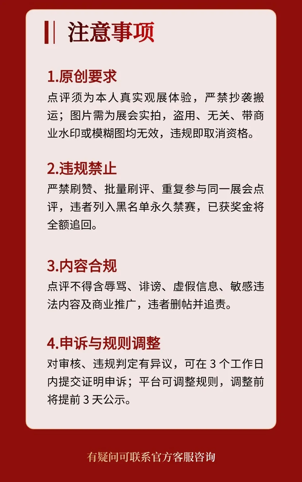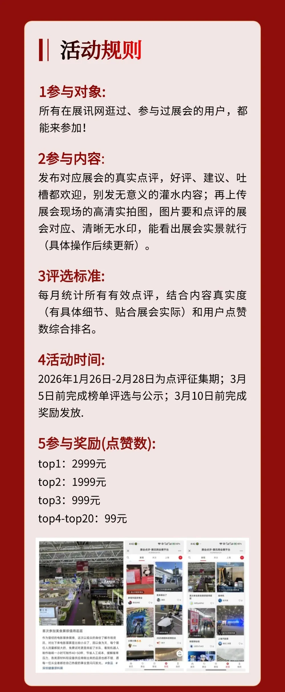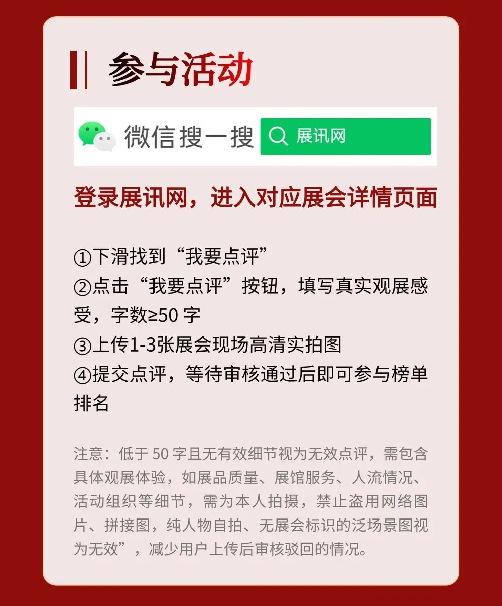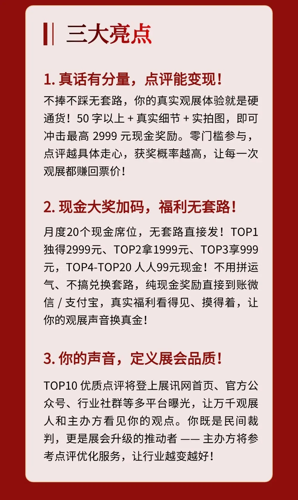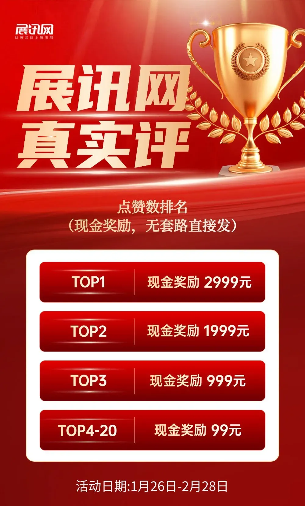新春将至,展讯网为回馈新老用户对平台的信任和支持,现推出展会点评功能,诚邀大家在平台进行评价,反馈平台及展会现场真实建议,只要排名上榜,奖励高达2999元!前20名都有机会拿走现金大奖,零门槛参与,快把逛展变成“真金白银”!