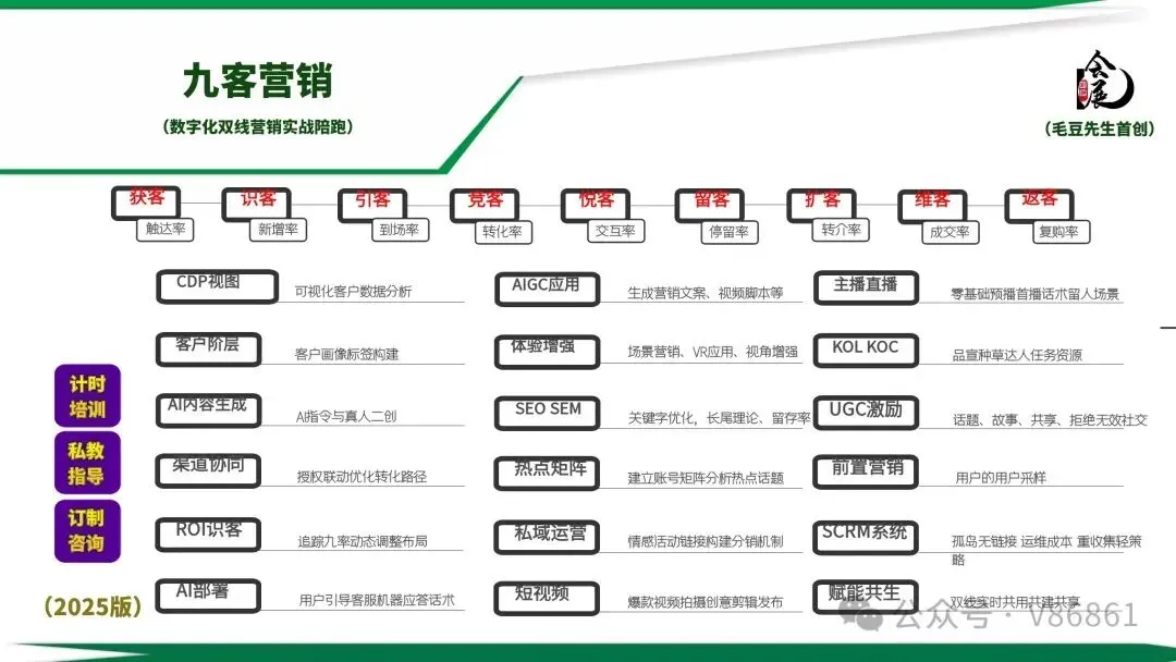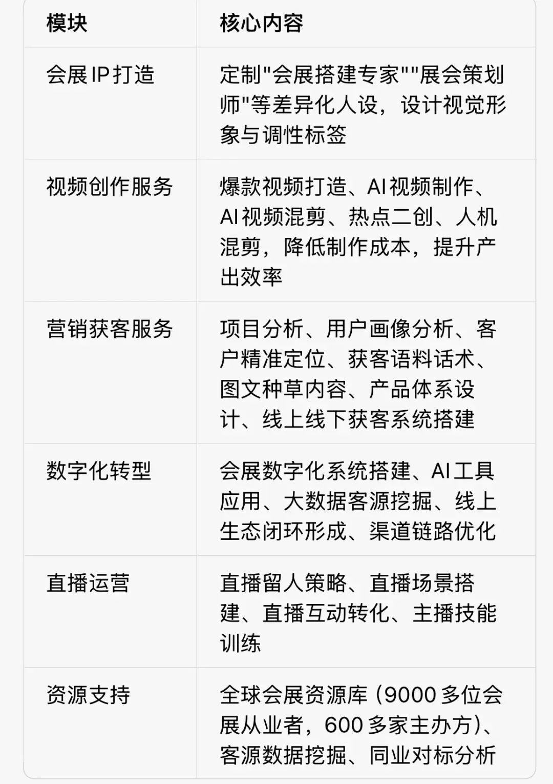 核心服务模块(九大体系)1. 数据资源类• 会展行业数据:整理各品类展会规模、参展商画像、行业趋势等核心数据,为IP定位提供依据• 客源数据挖掘:筛选精准参展企业、采购商、场馆方等客源名单,明确获客方向• 同业对标分析:拆解头部会展IP运营策略、内容形式、变现路径,提炼可复用方法2. 线上媒体类• 账号矩阵搭建:根据会展业务类型,定制抖音、视频号、小红书等平台账号定位与装修• 主播技能训练:针对会展人设计直播话术、镜头表达、互动技巧专项培训• 媒体渠道布局:对接会展行业垂直媒体、社群、公众号,拓展IP曝光渠道3. 视频创作类• 定制化脚本创作:围绕展会搭建、展位设计、参展攻略、行业干货等会展场景创作视频脚本• 专业拍摄剪辑:提供会展实景拍摄指导、素材剪辑优化、字幕特效制作服务• 全平台发布运营:根据各平台流量规则,制定发布时间、话题标签、互动策略,提升内容曝光• 爆款视频打造:拆解会展行业爆款逻辑,定制痛点型、案例型、干货型爆款选题,优化视频开头3秒黄金流量入口,提升完播率与转发率• AI视频制作:利用AIGC工具生成展会虚拟场景、产品演示动画、数字人解说视频,降低制作成本• AI视频混剪:通过AI工具智能抓取展会实景素材、行业热点片段,快速生成高质感混剪视频,提升产出效率• 热点二创:追踪会展行业政策、大型展会活动、行业热议话题,结合IP人设进行二次创作,借势流量曝光• 人机混剪:人工把控视频创意与叙事逻辑,AI负责素材筛选、字幕生成、音效匹配,兼顾效率与内容质感4. 营销销售类• 项目分析:针对会展展位搭建、展会全案策划等不同业务项目,拆解项目需求、成本构成、盈利空间,制定针对性销售策略• 用户画像分析:结合会展行业特性,构建参展企业决策人、场馆合作方、展会服务商等核心用户画像,涵盖企业规模、决策流程、需求痛点、偏好渠道等维度• 客户精准定位:基于用户画像,筛选高意向客户群体,划定目标市场区域与行业赛道,实现精准获客• 获客语料话术:设计展会展位销售、合作洽谈、客户跟进的标准化话术体系• 图文种草内容:创作会展案例解析、搭建技巧、行业资讯等图文内容,实现私域种草• 产品体系设计:协助梳理展位搭建、展会策划、IP代运营等服务产品包,提升客单价• 线上线下获客:◦ 线上获客:通过短视频引流、直播获客、私域社群裂变、行业平台留言互动等方式,获取精准意向客户线索◦ 线下获客:指导展会现场地推、行业沙龙拓客、合作场馆资源置换等获客动作,同步打通线下客源渠道◦ 客资管理:搭建客户线索分级体系,制定线上线下客资同步跟进流程,提升线索转化效率5. 人脉建设类• 社交圈拓展:链接会展行业协会、场馆方、参展企业负责人,搭建高端人脉网络• 社群圈运营:指导搭建会展客户社群、同业交流社群,制定社群活跃与转化规则• 公众圈打造:通过内容输出与活动策划,提升IP在会展行业的公众认知度与影响力6. 人设打造类• 会展IP定位:结合个人业务优势,打造“会展搭建专家”“展会策划师”等差异化人设• 视觉形象设计:定制符合会展行业调性的头像、封面、视频背景等视觉元素• 人物调性塑造:提炼专业、靠谱、懂行业的人设标签,通过内容与互动强化标签认知7. 在线直播类• 直播留人策略:设计会展知识问答、展位案例展示、福利抽奖等直播留人环节• 直播场景搭建:指导搭建展会实景、办公场景等直播环境,贴合会展业务场景• 直播互动转化:优化直播评论区互动、连麦沟通、粉丝团运营,实现直播获客与转化8. 经营管理类• 盈利模式设计:结合会展业务,设计IP广告变现、服务带货、会员付费等盈利模式• 渠道链路搭建:打通线上获客-线下谈单-服务交付的全渠道链路,提升转化效率• 成本效率优化:通过AI工具、标准化流程压缩内容制作与客户运营成本• 生态闭环打造:整合会展行业资源,搭建“IP内容-获客-服务-复购”的商业生态闭环• 线上生态闭环形成:搭建“内容引流-私域沉淀-社群培育-直播转化-复购裂变”的线上全链路生态,实现流量的持续变现• 渠道链路优化:梳理短视频平台、行业垂直平台、私域社群等渠道的流量特性,制定差异化的获客与转化策略,打通各渠道间的流量流转路径9. 双线运营管理• 团队分工管理:明确线上运营、线下业务团队的职责边界与协作流程,避免工作重叠• 数据同步管理:搭建线上线下运营数据看板,实时同步流量、获客、转化等核心数据,统一分析决策• 节奏协同管理:制定线上内容运营与线下展会活动的协同节奏,如展会前线上预热、展会中直播引流、展会后内容复盘• 资源调配管理:根据线上线下业务需求,灵活调配人力、物料、渠道资源,最大化资源利用效率服务模式说明1. 限量深度绑定• 年度仅开放5个会展行业IP陪跑名额,采用深度绑定合作模式,全周期跟进IP从0到1的打造与运营,聚焦服务质量与成果落地• 深度绑定权益:专属陪跑顾问1对1服务、定制化运营方案、每月不少于8次的实时沟通、季度运营战略复盘、年度IP发展规划制定2. 服务形式界定• 核心服务形式为远程协作,包含线上微信1对1、实时沟通、文件交付、数据复盘等线上服务内容• 不包含的服务:线下面授课程、现场拍摄指导、展会现场执行、线下商务洽谈等线下落地类工作服务