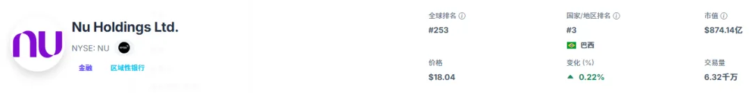 Nu Holdings是巴西领先的金融服务公司,旗下运营数字银行Nubank(一家总部位于巴西的数字银行,也是世界上最大的私营金融科技公司之一),业务覆盖巴西、墨西哥、哥伦比亚等拉美地区。