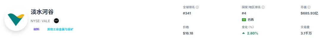 淡水河谷,即巴西淡水河谷公司(Companhia Vale do Rio Doce,简称Vale),世界第一大铁矿石生产和出口商,公司成立于1942年6月1日,总部位于巴西里约热内卢。