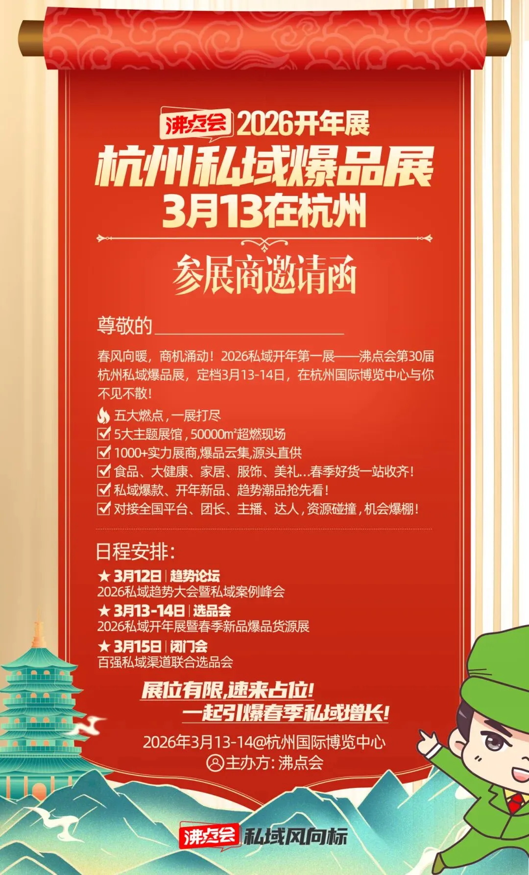 杭州私域开年展暨春季新品爆品货源展,即将于 2026年3月13日至14日 在 杭州国际博览中心 隆重举办。本次展会由深耕行业十一年的 沸点会 主办,不仅是一场全品类的选品盛宴,更将成为跨境特色产品对接国内庞大私域渠道的关键枢纽。