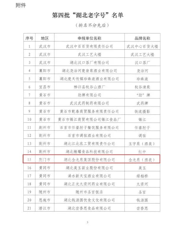 2022年,在湖北省商务厅认定第四批湖北老字号企业和品牌名单中,金龙泉榜上有名,也由此成为行业类获得老字号称号为数不多的企业之一。
