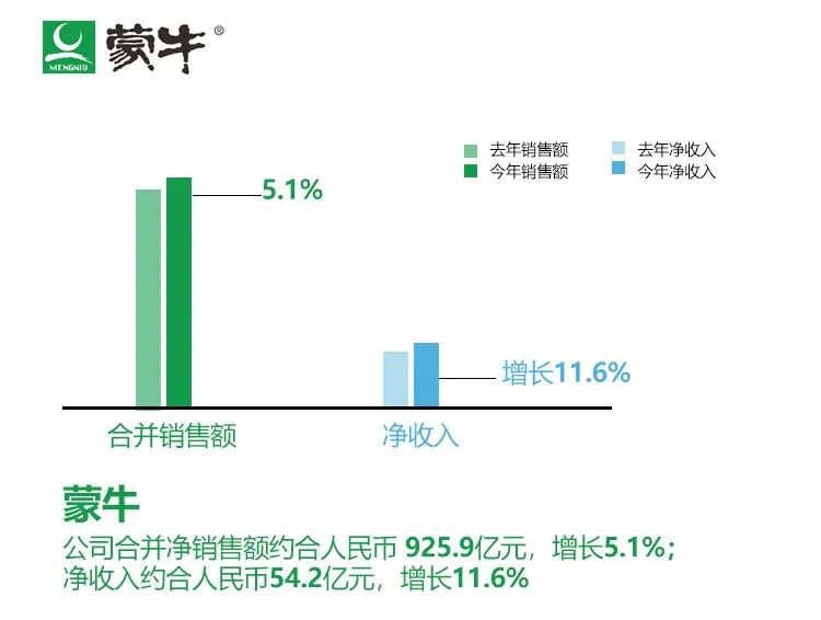 按四大业务板块来看,液态奶产品(包括超高温灭菌奶、乳饮料、酸奶及鲜奶)实现营业收入782.7亿,同比增长2.3%,占蒙牛总收入的84.5%,特仑苏、蒙牛纯牛奶、每日鲜语鲜牛奶保持强势增长;冰淇淋产品实现56.5亿,同比增长33.3%;奶粉产品实现38.6亿;其他产品(奶酪、乳制品原辅料生产及经销贸易业务)实现48.1亿。