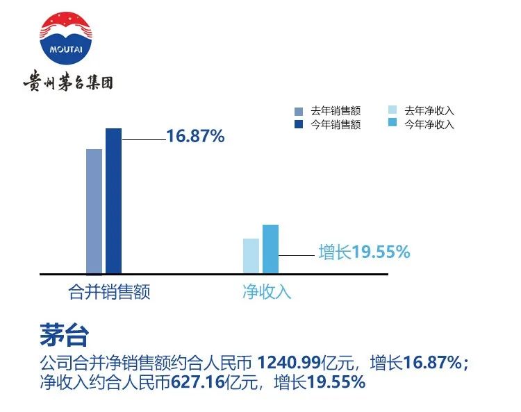 年报显示,贵州茅台2022年实现营业收入1240.99亿元,同比增长16.87%;净利润627.16亿元,同比增长19.55%;基本每股收益49.93元。对比2021年年报来看,营收、净利、扣非净利三项业绩和增速均同比增加。