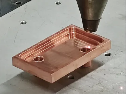 蓝光复合焊接技术通过能量精准调控,可大幅抑制焊接飞溅,配合微米级光斑聚焦能力,热影响区小,远优于传统焊接工艺。这一特性对液冷板尤为关键——能有效避免飞溅物堵塞微流道、热变形导致的流道偏移,确保液冷板在高压工况下的密封性。