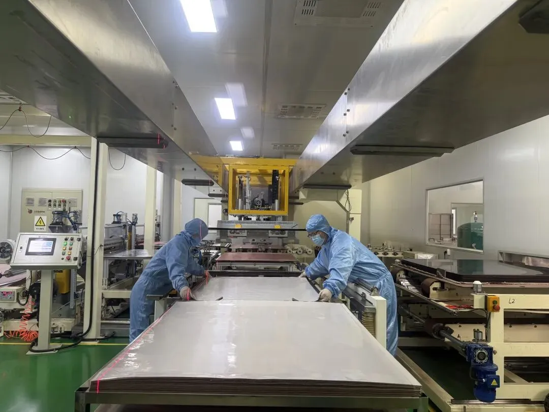 走进久耀电子的恒温恒湿净化车间,规律的低鸣与平稳的滑动声交织成现代制造的韵律。自动化产线上,银白色的电子玻布徐徐展开,均匀涂覆上淡金色的特制浆料,经过300℃高温的精准“淬炼”,化为光洁平整的半成品,再经精密裁切、叠合、压合与检验,最终成为一片片品质过硬的高频覆铜板。