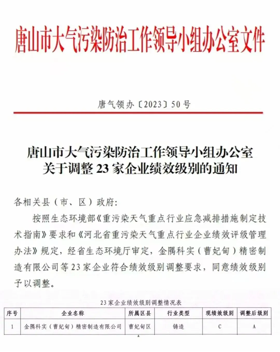 金隅科实公司获评河北省重污染天气重点行业企业绩效评级“A级”企业