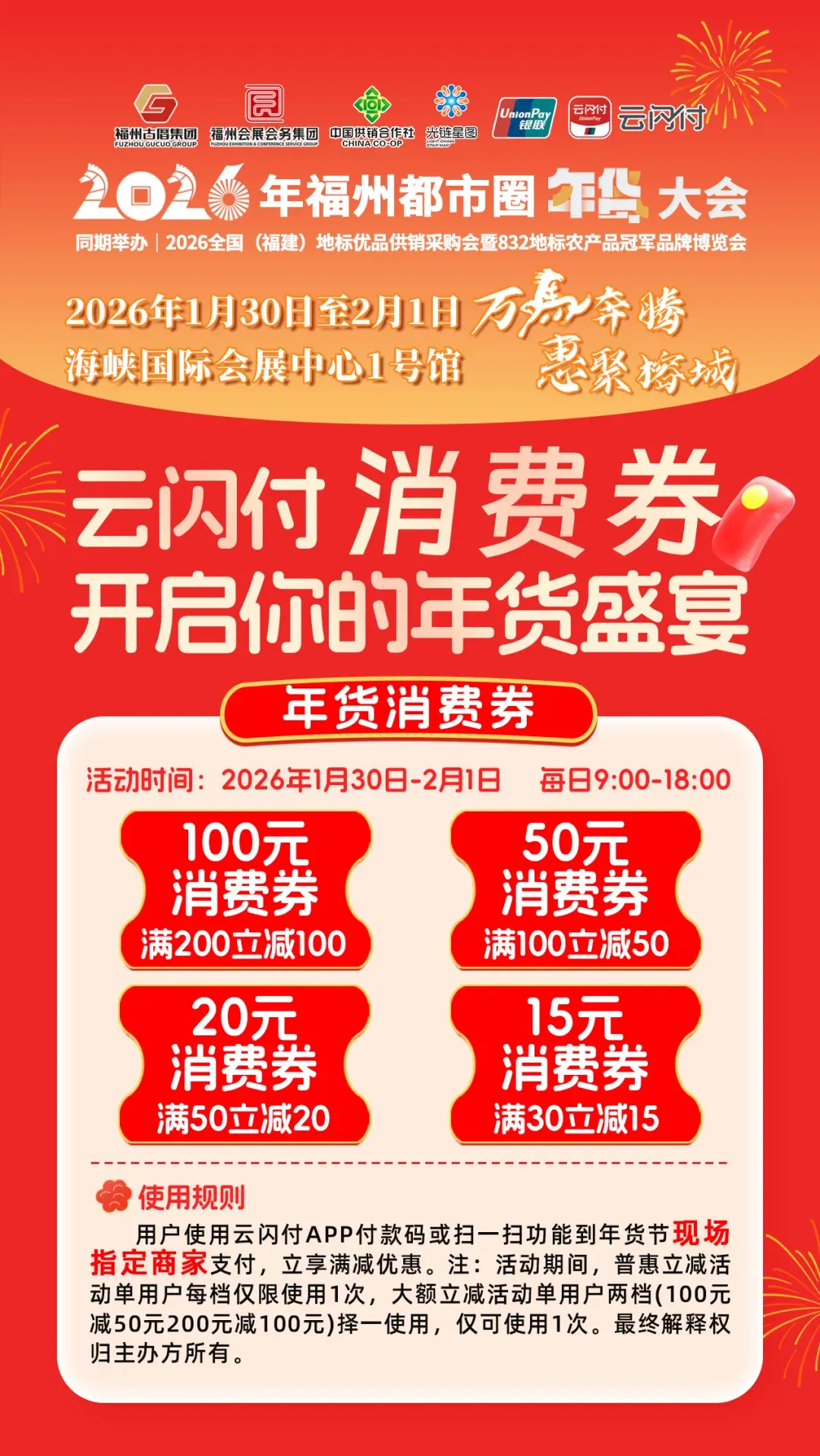· 使用方式:在年货大会现场指定商家消费,使用云闪付APP二维码付款,自动抵扣对应满减优惠。
