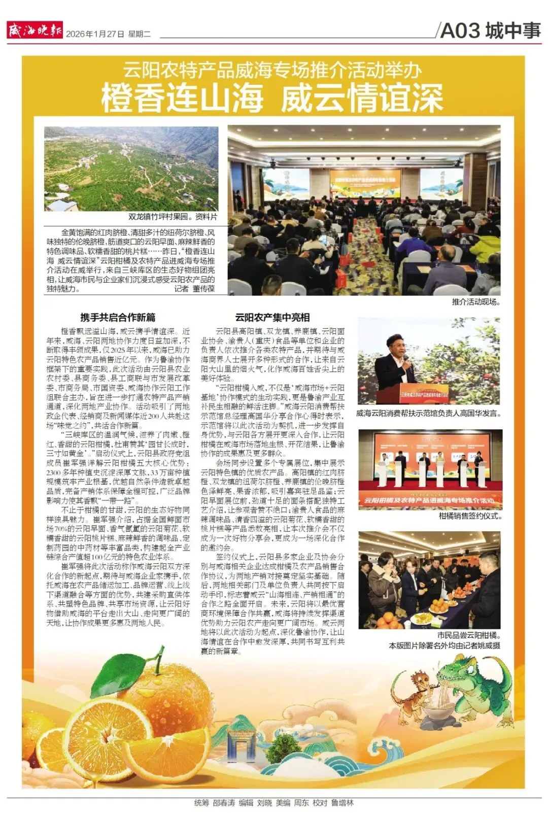 “云阳柑橘入威,不仅是‘威海市场+云阳基地’协作模式的生动实践,更是鲁渝产业互补民生相融的鲜活注脚。”威海云阳消费帮扶示范馆总经理高国华分享合作心得时表示,示范馆将以此次活动为契机,进一步发挥自身优势,与云阳各方展开更深入合作,让云阳柑橘在威海市场落地生根、开花结果,让鲁渝协作的成果惠及更多群众。