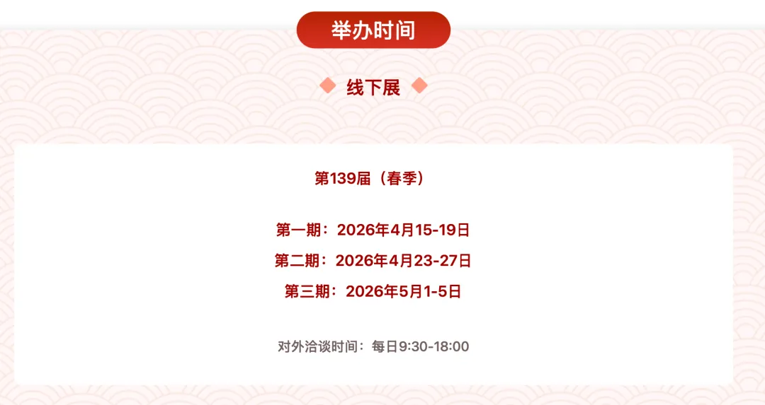 2026年4月15日-5月5日,第139届广交会于广州重磅启幕!第一期聚焦电子及家电、照明、车辆及配件、机械、五金工具等工业类核心展品,全球采购商齐聚,外贸商机蓄势待发!