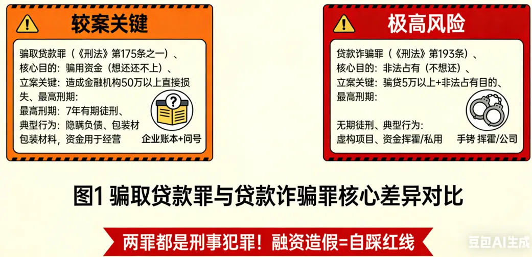 骗取贷款罪 + 贷款诈骗罪 = 牢狱之灾!这是企业融资路上两条绝不能碰的刑事红线。融资难是不少企业的现实困境,但有些企业主为了拿到资金,抱着 “走捷径” 的心态虚构材料、隐瞒负债,却不知道 —— 哪怕是 “想还” 的造假,也可能触犯骗取贷款罪;如果抱着 “不想还” 的目的骗贷,更是会撞上量刑更重的贷款诈骗罪。前者最高判 7 年,后者最高可判无期徒刑,不仅会让企业陷入绝境,更会让自己身陷囹圄。2023 年以来,最高人民法院公布的刑事审判参考案例、地方法院典型判决也共同为企业融资划出明确法律边界:下文两案主导者均为企业相关责任人,都使用了虚假材料,都涉及巨额资金,但因主观目的与资金去向的本质不同,最终迎来截然不同的法律判决。这不仅是司法定论,更是给所有企业主的生死攸关的风险公开课。