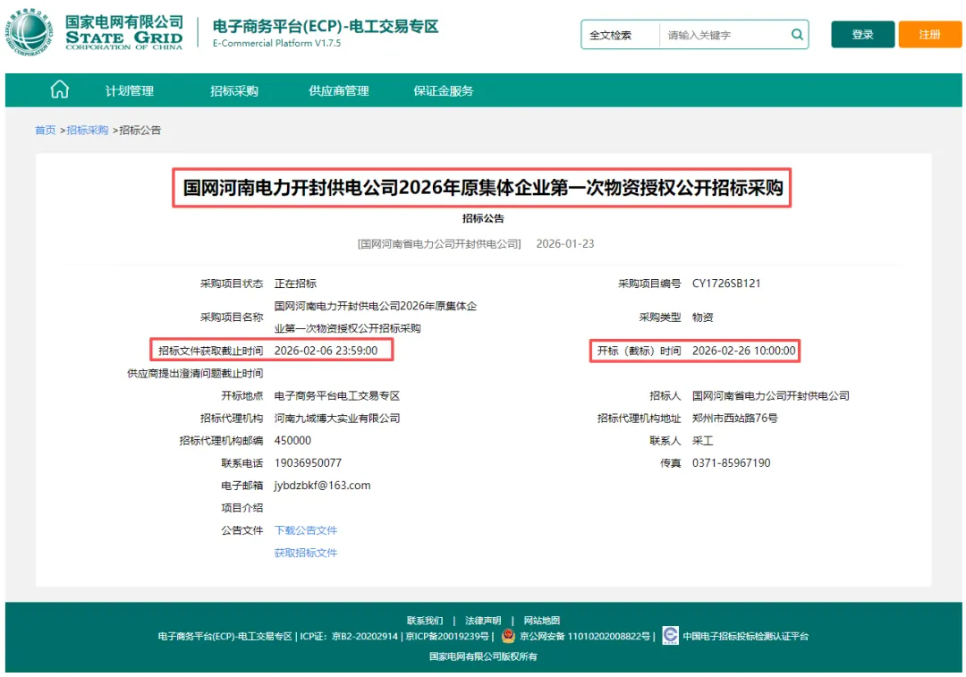 招标文件(电子文件)免费获取。凡有意参加投标者,请于2026年1月23日-2026年2月6日23:59时(北京时间,下同),登录招标人招投标交易平台信息系统(国家电网有限公司电子商务平台-电工交易专区¨https://ecp.sgcc.com.cnþhttps://sgccetp.com.cn,以下简称电子商务平台)获取招标文件,并按《电子招标投标办法》等国家法律法规要求,到第三方认证机构办理CA证书电子钥匙。投标人应妥善保管招标人招投标交易平台信息系统账号和密码,以及CA数字证书和密码,因上述账号、数字证书或密码保管不当造成的损失,由投标人自行承担。