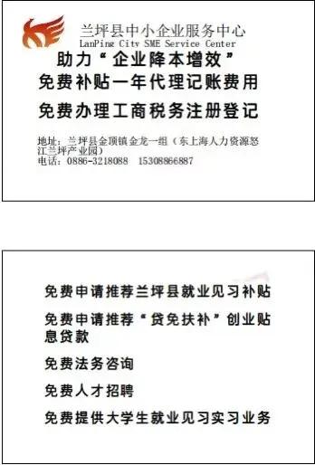 代理记账:免费为客户办理代理记账服务价格为2980一年,以兰坪中小企业服务中心再免费补贴一年,相当于两年价格为2980,为企业达到降本增效的效果。