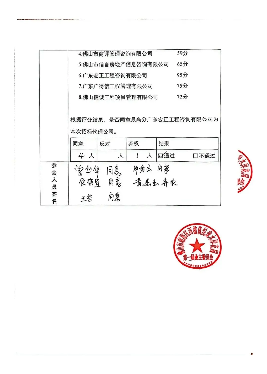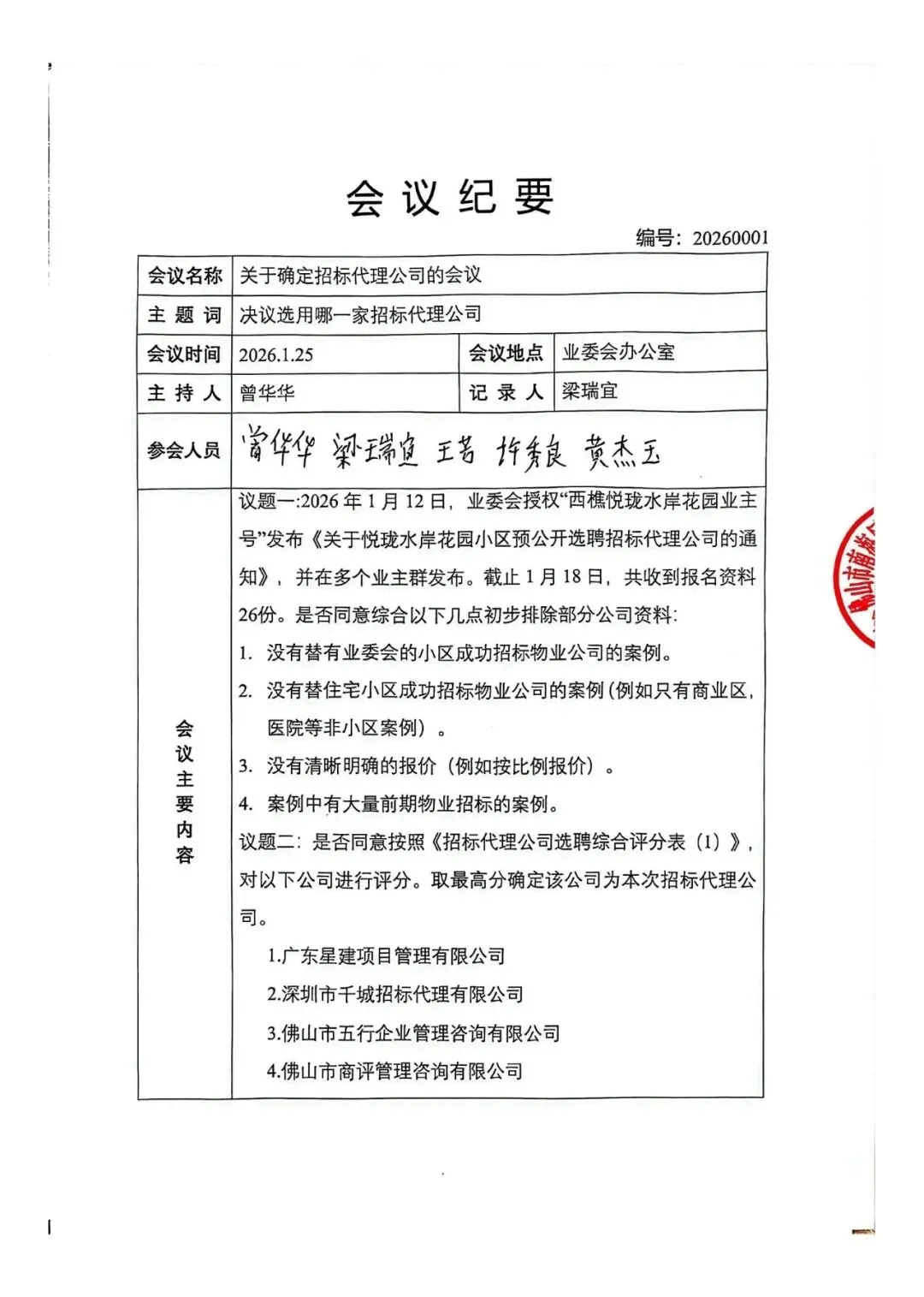 一共收到26份招标代理公司资料,根据业委会审核和评分,最后取高分广东宏正工程咨询有限公司为本次招标代理公司,特此公告。