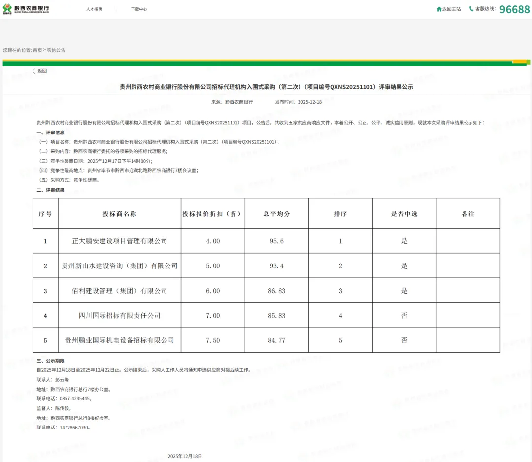 2025年12月18日,经评标委员会综合评审,招标人确认。正大鹏安建设项目管理有限公司成功入围贵州黔西农村商业银行股份有限公司招标代理机构采购(第二次)项目。