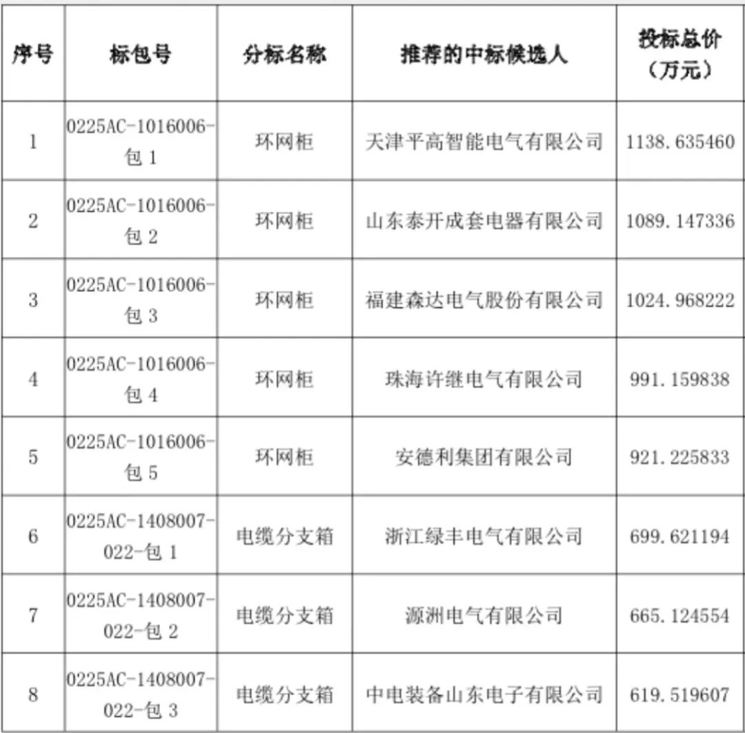国网北京市电力公司2025年第三次配网物资协议库存公开招标采购(招标编号:0225AC)评标工作已经结束。依据《中华人民共和国招标投标法实施条例》、《招标公告和公示信息发布管理办法》对中标候选人公示的规定,现将评标委员会推荐的中标候选人予以公示,公示期3日。投标人或者其他利害关系人若对评标结果有异议的,请在中标候选人公示期间以书面形式(邮件)提出。