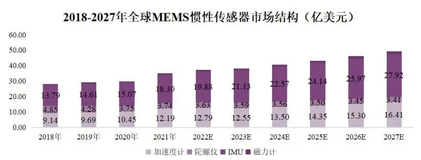 本报告聚焦于MEMS(微机电系统)传感器行业,重点分析以MEMS惯性传感器(加速度计、陀螺仪、IMU)为核心的细分市场,并适度覆盖MEMS压力/力度传感器及传感器模组。MEMS传感器是连接物理世界与数字世界的基础器件,广泛应用于消费电子、物联网、汽车电子、工业控制等领域。全球MEMS市场规模由2018年的约100亿美元增长至2021年的约136亿美元,预计2027年将达约223亿美元,2021—2027年复合增速约8.5%。惯性传感器和压力传感器是MEMS传感器市场最主要的两个大类,其中加速度计市场2018—2027年复合增速约6%—10%,保持稳健增长。全球MEMS行业长期由博世、ST、TDK、ADI等IDM巨头主导,中国大陆及周边地区厂商在前30大厂商中占比仍然偏低。国内部分企业专注于MEMS惯性传感器设计,形成了以MEMS加速度计为核心的产品组合,拓展至MEMS压力传感器与传感器模组,并广泛进入国内外主流品牌终端。MEMS传感器是利用微加工工艺在硅晶圆上制备的微型传感器,可将外界物理量(如加速度、压力、声音、温度等)转换为电信号。惯性传感器包括MEMS加速度计、MEMS陀螺仪、磁力计以及IMU等,用于检测物体的加速度、角速度、姿态和方位。本报告主要关注电容式MEMS加速度计及相关惯性器件,兼顾力度/压力传感器和振动/倾角模组等延伸产品。- 第一阶段(20世纪80—90年代):以汽车安全应用为起点,如安全气囊、胎压监测等,Honeywell等企业率先实现压力及加速度传感器的产业化。