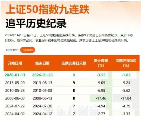 洋河股价昨天跌停,今天又大跌,两个长阴下穿了多年来的新低。原因是市场缩减,利润下滑,老登就是曾经有多少底,一眼看不到头的黑暗,这谁也扛不住。这个时候不能讲体面,得学学当年的万科郁亮,也是年轻人刚刚主政白酒行业紧跟房地产行业,一同繁荣,一同衰落不一定,看谁抓住年轻人的心。毕竟是消费品。哪谁江小白,不就玩的转。茅台尝试过了,什么冰淇淋,咖啡了都没成,“历史的包袱太重”2026一月份以来,上证50走了九连阴,几乎又创下了历史纪录。