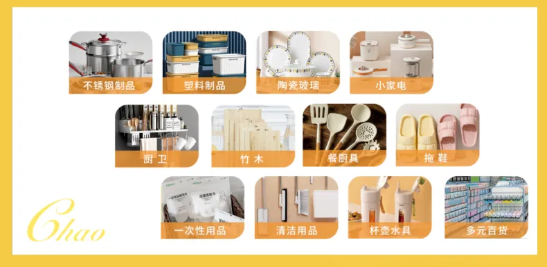 涵盖不锈钢厨餐具、塑料制品、陶瓷制品、厨卫收纳、清洁用品、杯壶水具、玻璃制品、竹木餐厨具、家用陶瓷、小家电、炊具、刀剪、收纳用品、晾晒用品、一次性用品、家卫家清等。