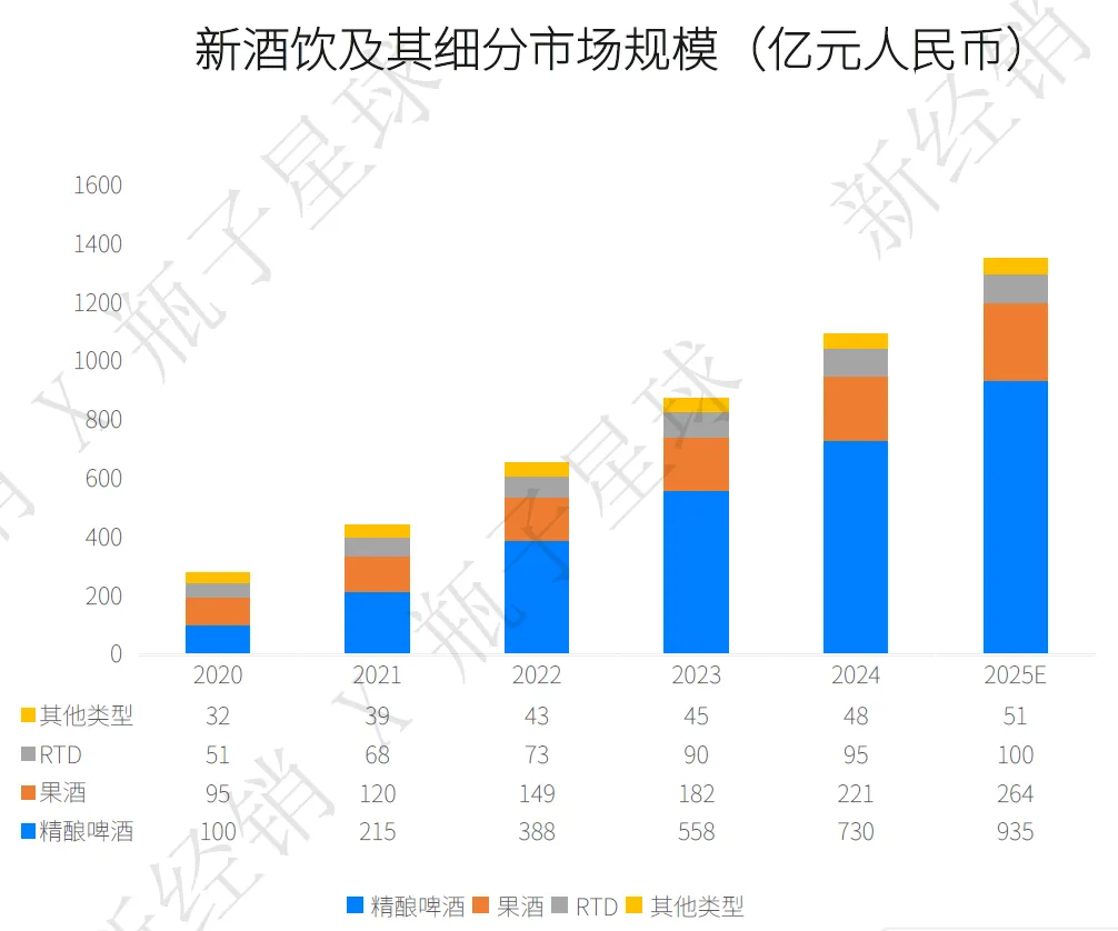 对比之下显差距。据新经销&瓶子星球发布的《2025新酒饮行业发展报告》,2020-2025年新酒饮(精酿啤酒、果酒、RTD即饮酒、气泡酒、低度酒等)市场复合增长率37.18%,2025年市场规模约1351亿元。