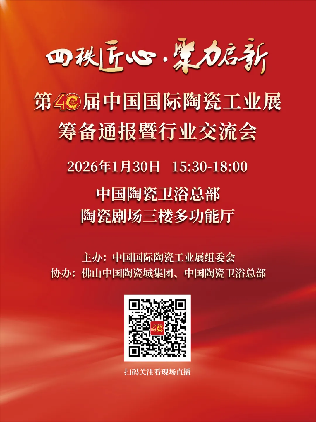 为全面介绍本届展会的筹备进展情况,深入探讨行业趋势与未来机遇,展会主办方定于2026年1月30日下午在佛山中国陶瓷卫浴总部·陶瓷剧场3楼多功能厅举办“四秩匠心·聚力启新——第40届中国国际陶瓷工业展筹备通报暨行业交流会”。