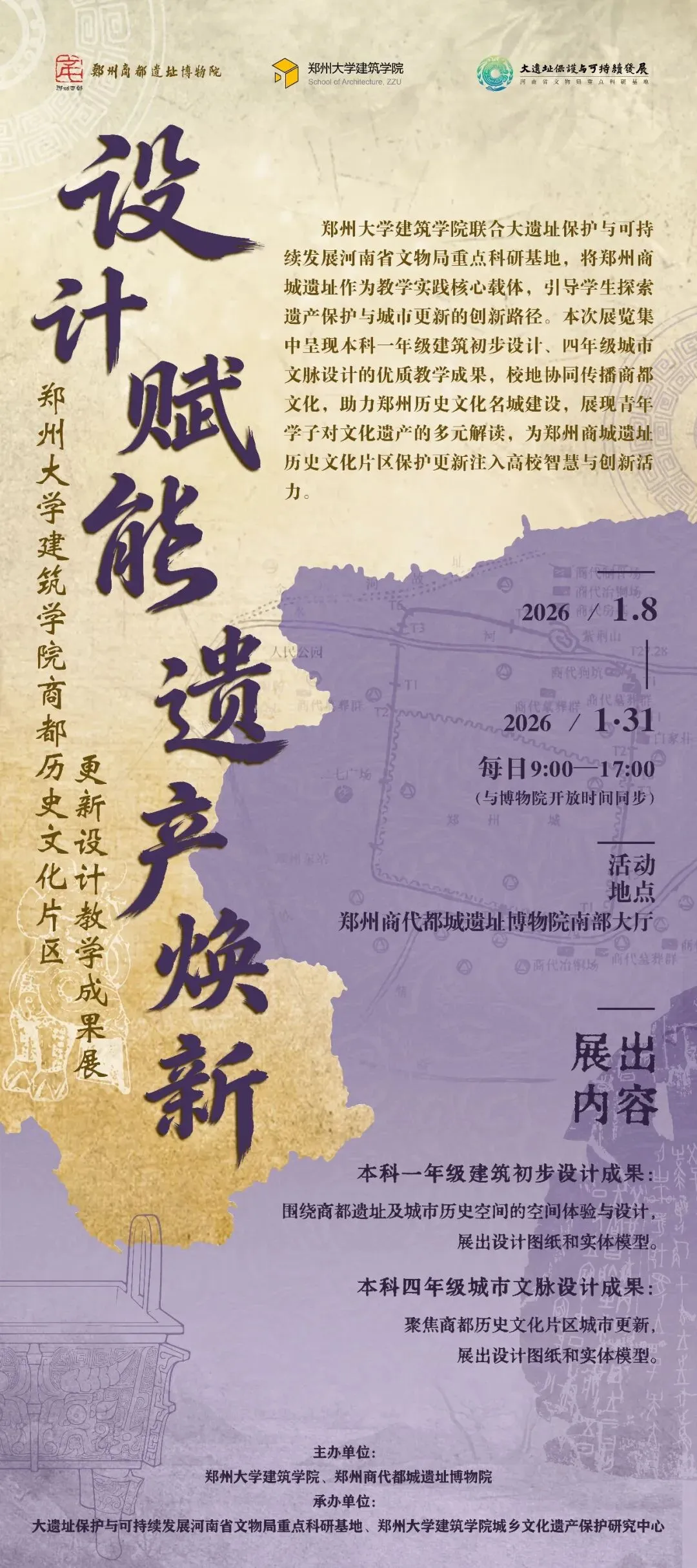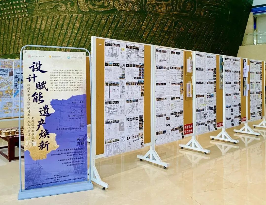 1月8日,由郑州大学建筑学院联合郑州商代都城遗址博物院主办,大遗址保护与可持续发展河南省文物局重点科研基地、郑州大学建筑学院城乡文化遗产保护研究中心承办的“设计赋能·遗产焕新——郑州商城遗址历史文化片区更新设计教学成果展”,在郑州商城遗址博物院南部大厅正式开展,展览将持续至1月31日。