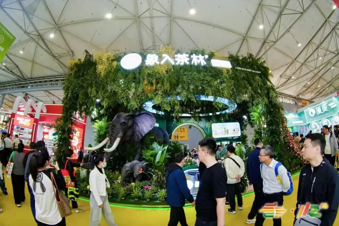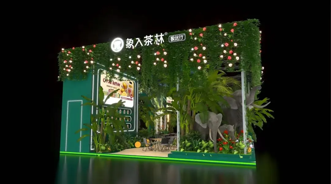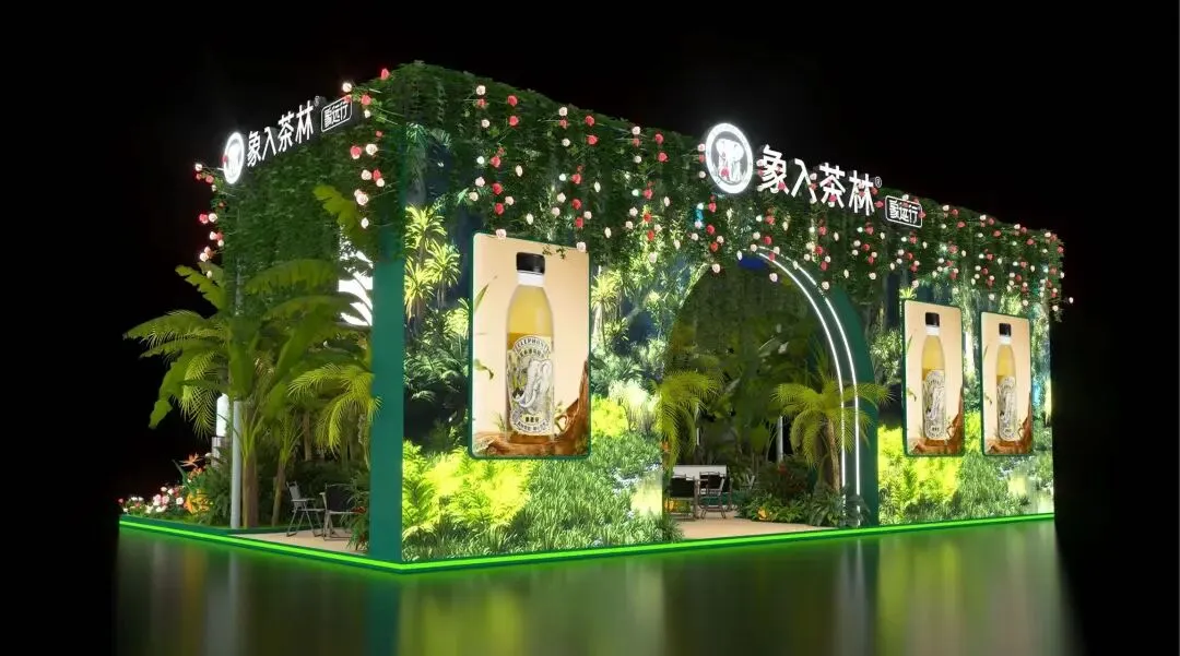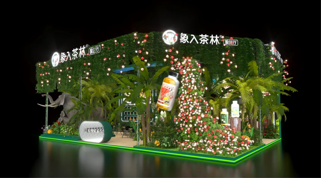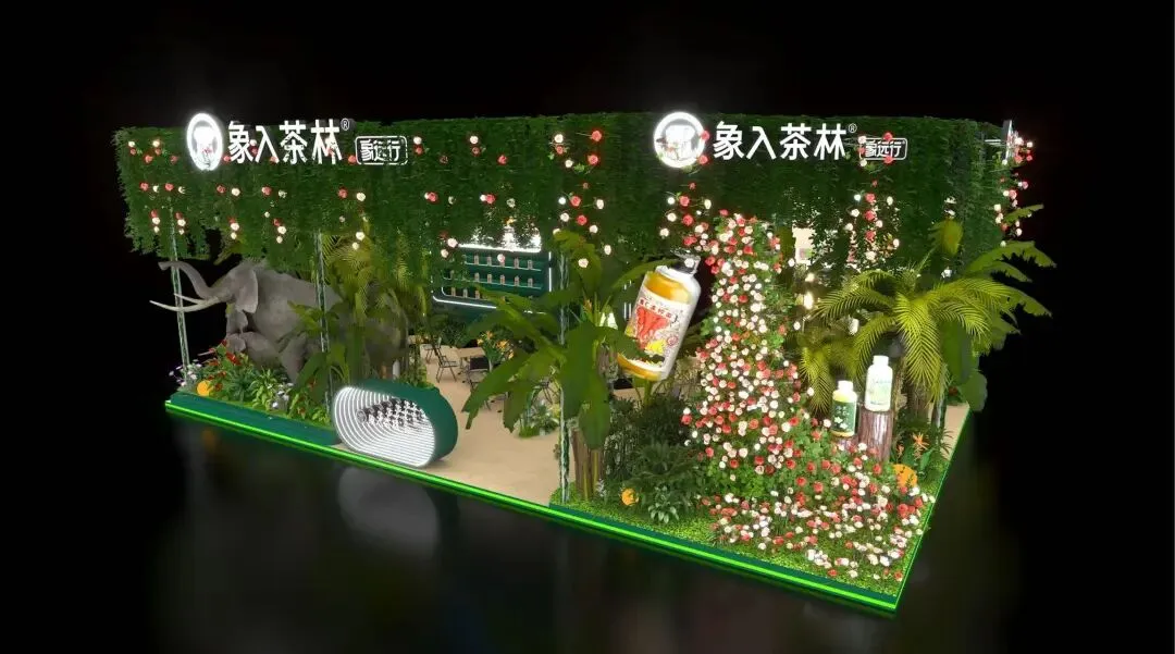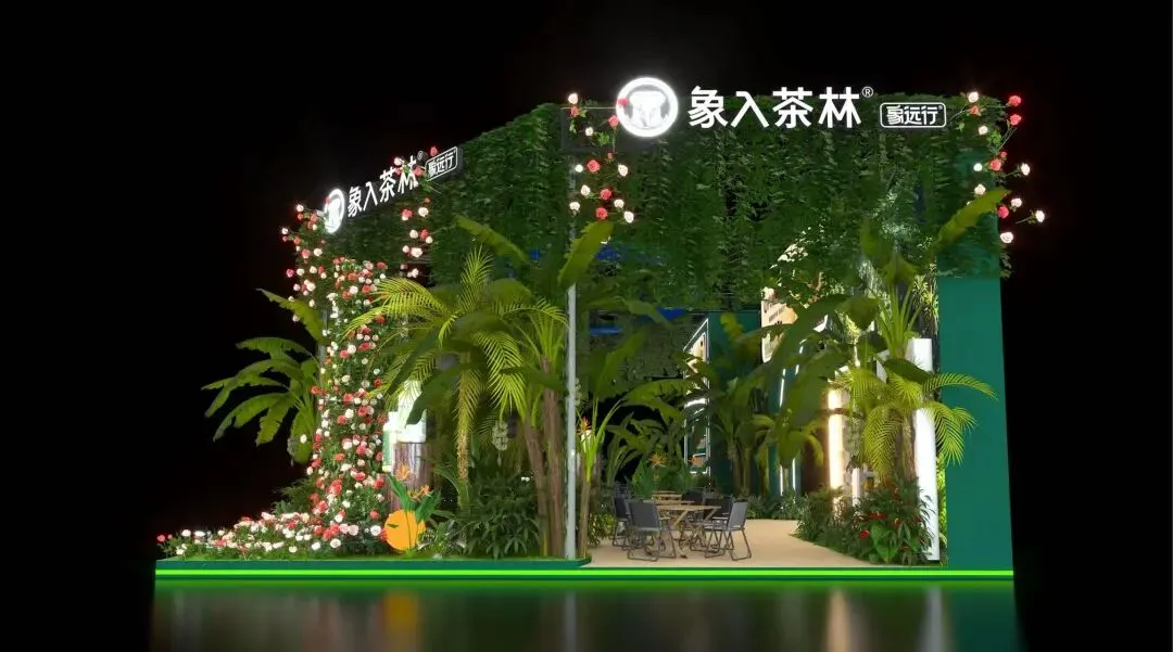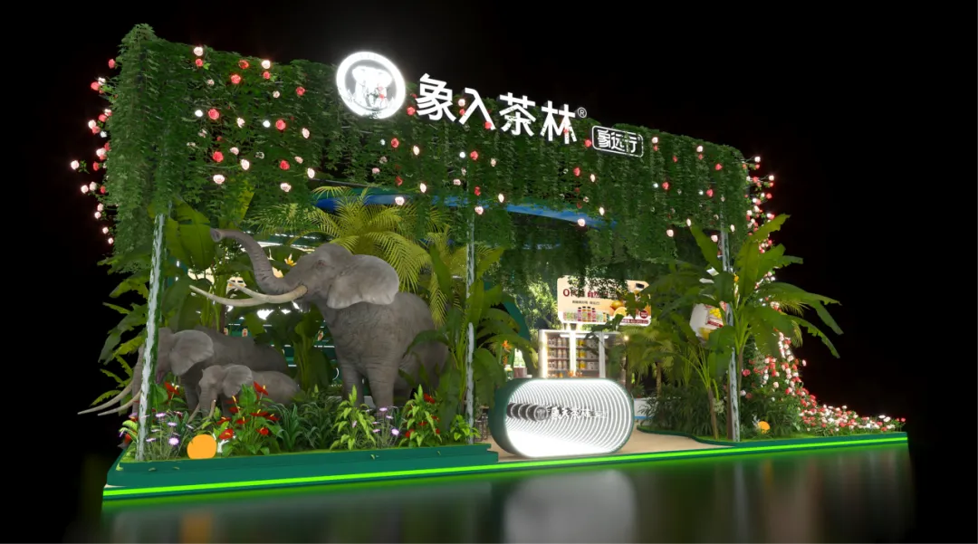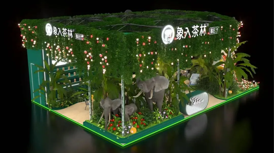 “把雨林搬进展会现场。”当你逛展时,突然闯入一片绿意盎然的“雨林秘境”,巨大的大象雕塑在藤蔓间若隐若现,热带植物与星光灯带交织出奇幻氛围——这不是科幻场景,而是德川吉展览为「象入茶林」打造的现象级展会现场。