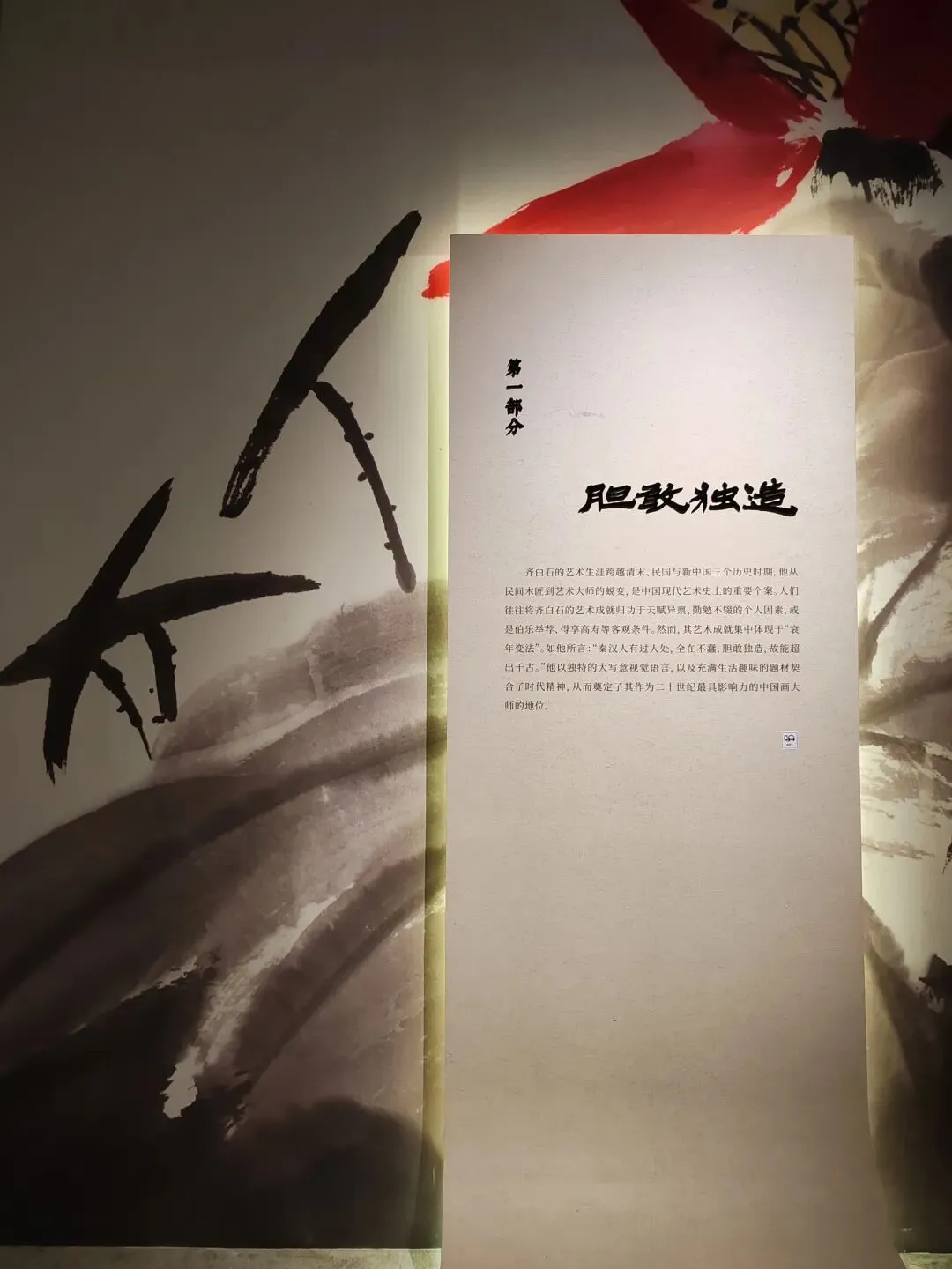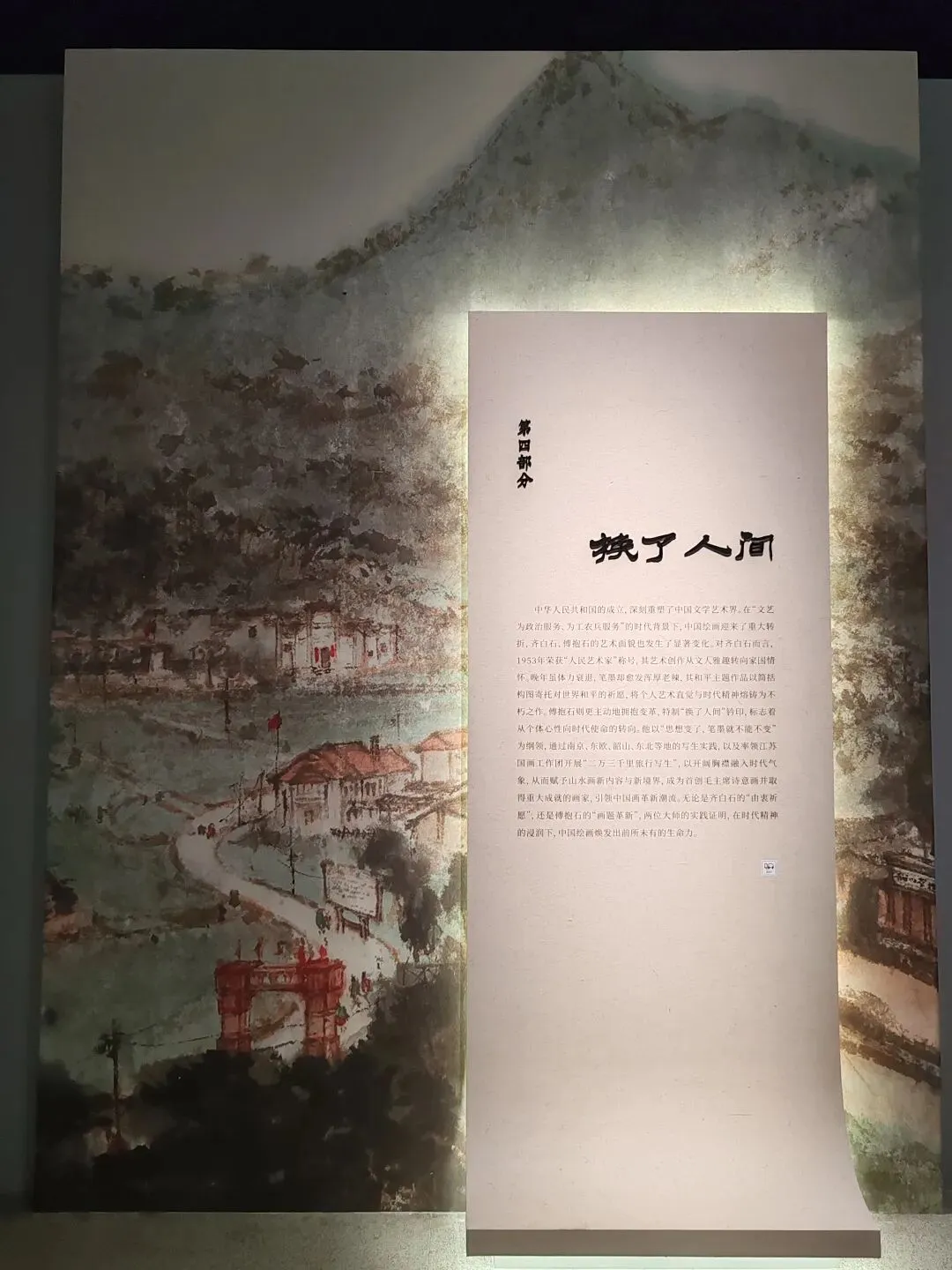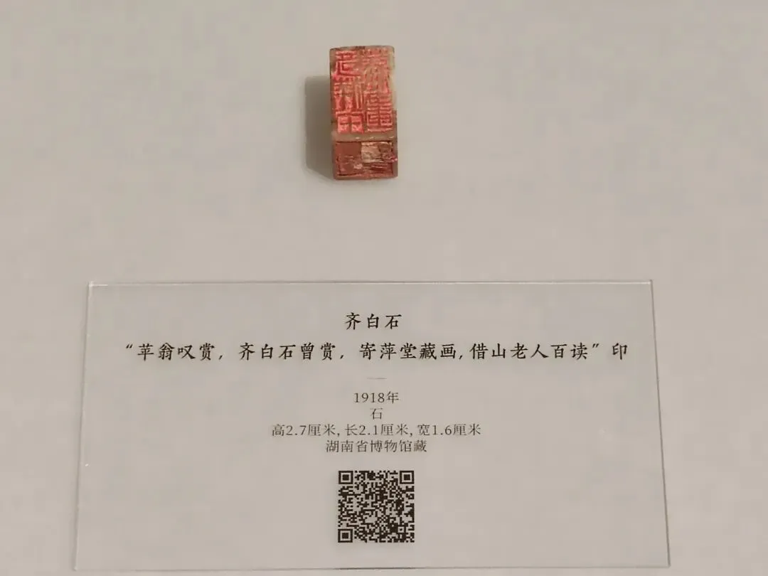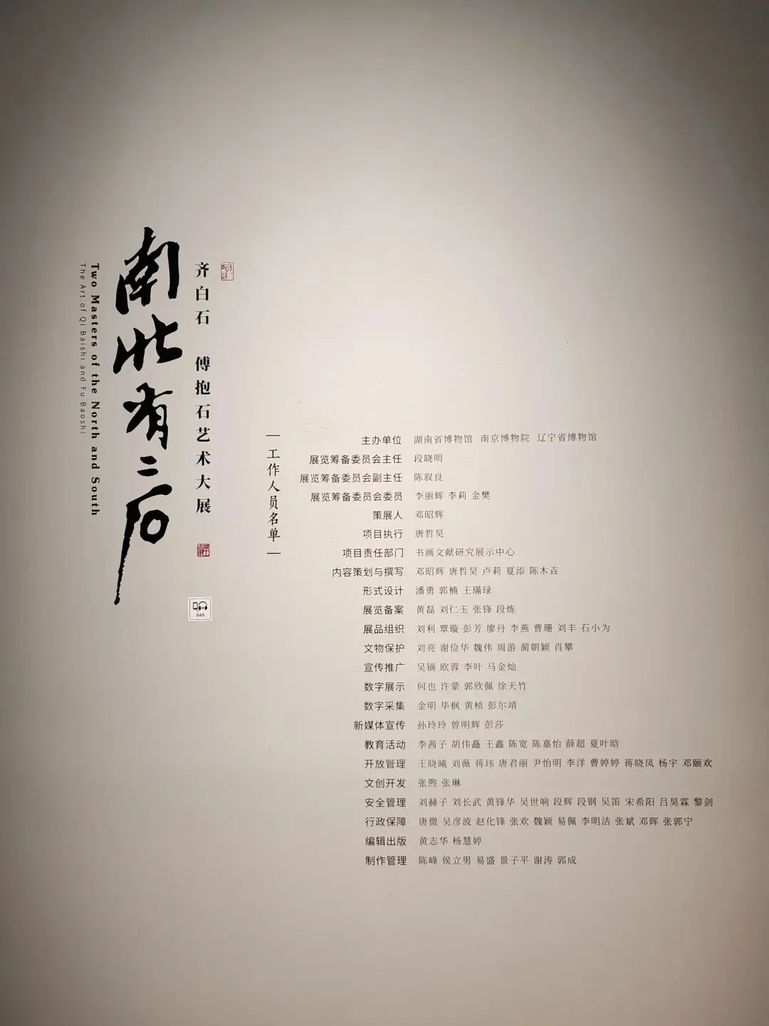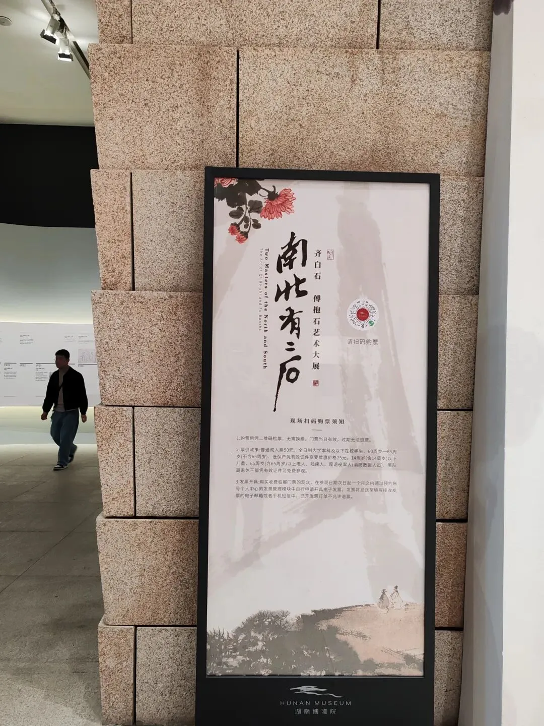 走在街上,微冷。商贩们,早早地就摆开摊位,艰难地招揽着生意。 在东风路与德雅路的十字路口,远远地,可以看到常绿行道树后,露出了湘博半遮半掩的侧脸。 小小的孩童,坐在手推车上,和我们一起等着红灯,准备过马路。 进了湘博,现在楼上往外看,是鲜活的当下,21世纪的长沙和中国。 在一楼的北侧,就可以看到《南北有“二石”》的巨型宣传立牌。 在展厅的门口,从左往右,就立着三块形状各一的立牌。 序厅是开放型的,没有买票的观众,也能够看到展览的序言:“二石”艺术年表。 把齐白石和傅抱石两位20世纪最伟大的两位中国画家放在一起比较展出,这应该是第一次。 把他们放在一起展出的逻辑,是他们都是20世纪中国画创新,贡献最卓著的几位大家之一。 在上个世纪,在中国画创新上面,能与他们并肩的,大概只有吴昌硕、张大千、徐悲鸿和黄永玉等寥寥数人。 讲的是白石老人“衰年变法”的历程和他的“红花墨叶”大写意花鸟画。 讲的是白石老人通过对前人的继承与扬弃,通过对自然与生活的观察,在构图与笔墨上多有变革,最后形成了他独特的富有生活气息与神韵的艺术表达。 在这一部分的结尾,有一个观众与AI进行互动的小环节。 这一部分,讲的是齐傅二人的篆刻艺术。展出的是他们的印章。 第三部分叫:《其命维新》。“其命维新”,是傅抱石的一枚印章。 所以,这一部分,是说的傅抱石的艺术创新活动与成就。 讲的是傅抱石独创“抱石皴”,从中国古人古诗、日本绘画和时代精神中创新山水画法的过程与成就。 这一部分是展示的傅抱石与齐白石在新中国成立后,与时俱进,进行创新的历程及成果。 最近几年,我也参观了二三十家博物馆。我发现湖南省博物馆有一个与众不同的特点,或者说优点。 就是,绝大多数的博物馆,不会凸显策展中的具体的工作人员,而只是让笼统的某某博物馆某某中心这个集体的名义出现在公众的面前。 但是湖南博物馆会把策展中的每一个工作人员的名字,展示在公众面前。个人的贡献与荣耀,领导和集体不会剥夺。 这是一个非常好的传统,折射出“眼睛中有人”的人文主义精神。 如果,能像其他博物馆一样,摆放一些蒲团或者坐垫就好了。 展厅的出口旁,有一个小小的文创商店,店子和商品,都很精致。 展厅中的插花,都还有点意思。都能与相关单元的意旨贴合。 观众们走在展厅里,也融入了展陈之中,变成了画中的人物。 我挑选了一些我喜欢且认为重要的展品,拍摄下来,列举如下: 艺术品,尤其是书法与绘画,是需要到现场揣摩原作的。